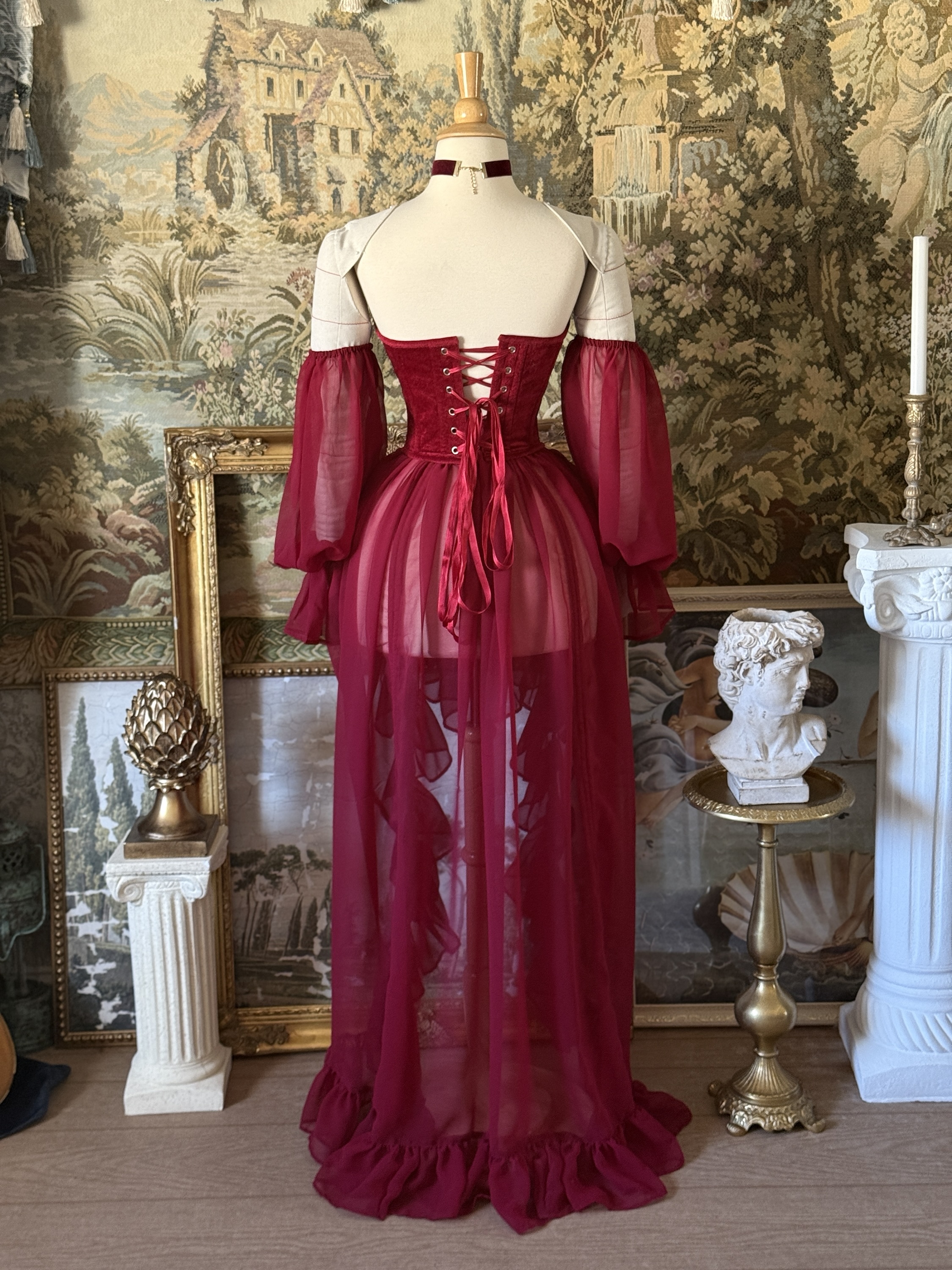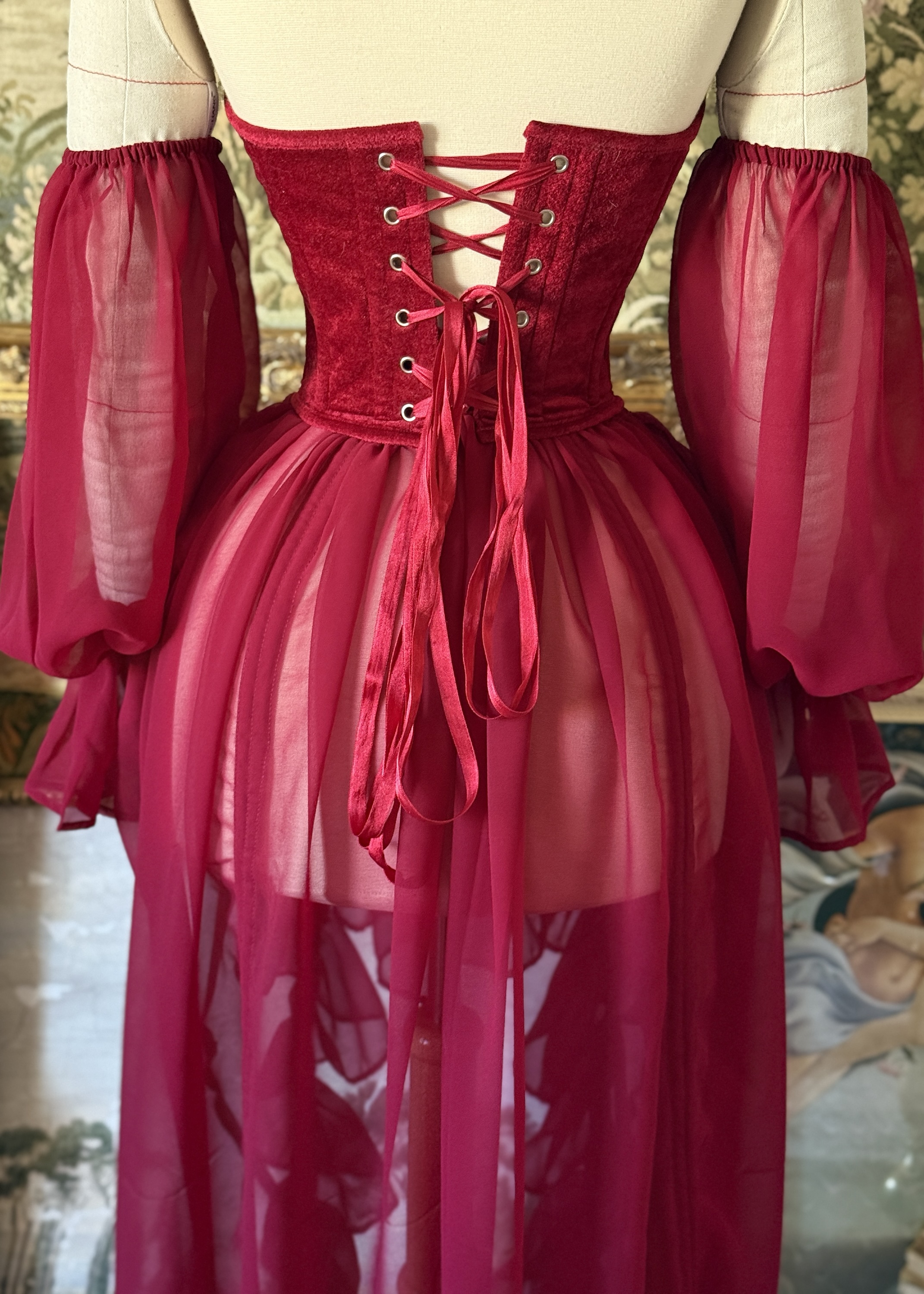 The Amour Skirt is romantic yet seductive, with sheer fabric that turns heads and makes a statement! The long length allows for dramatic billowing volume and a trailing train (length is adjustable with the drawstrings). Style it alone or layer it on top or under other skirts or dresses to level up your ensemble! Styled here with the Detached Sleeves – Rouge, and the Milady Corset.