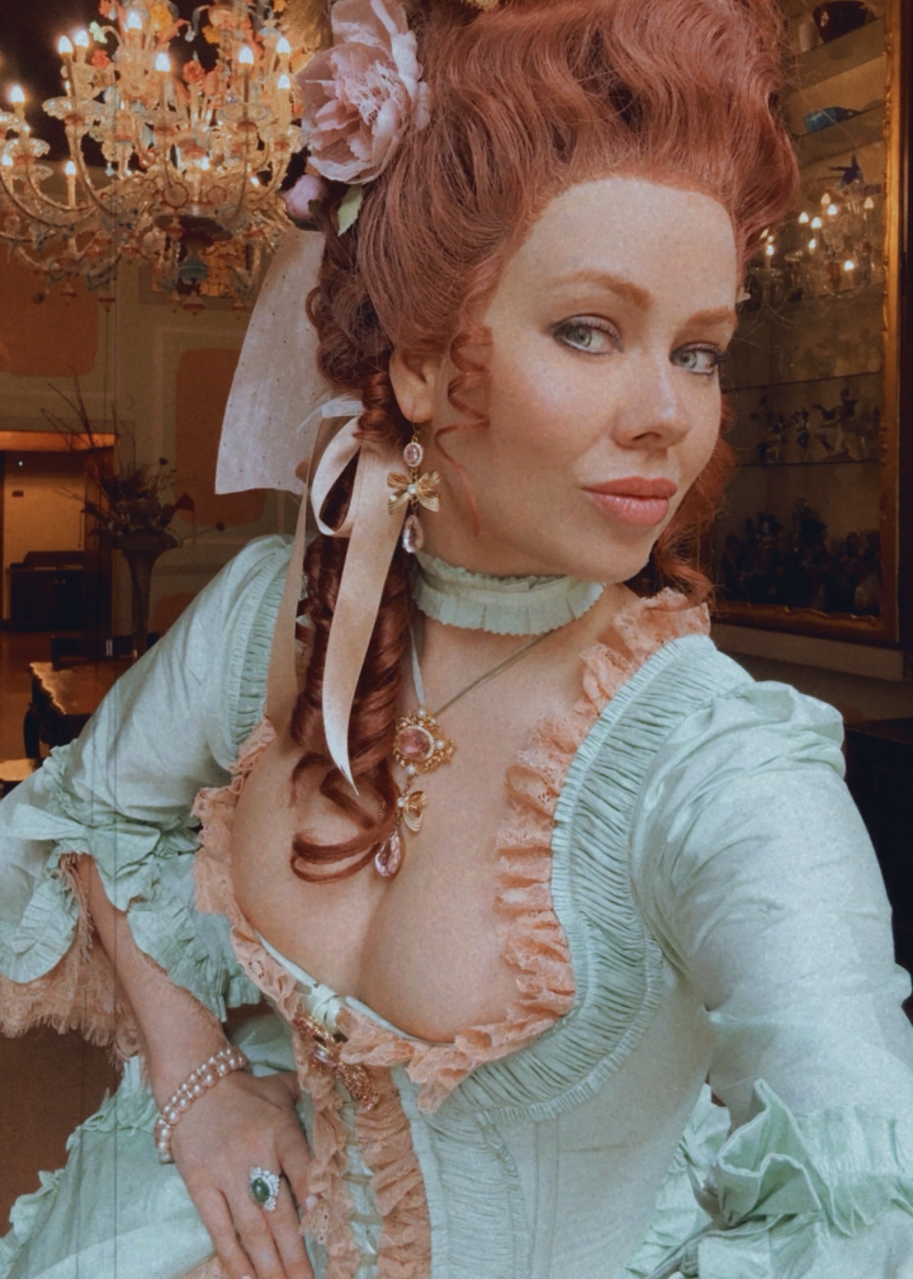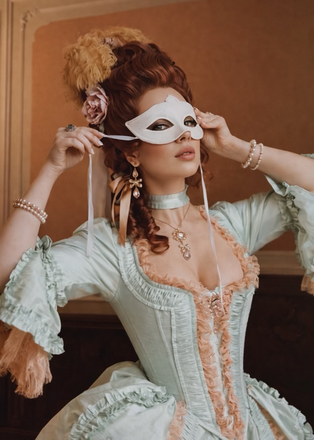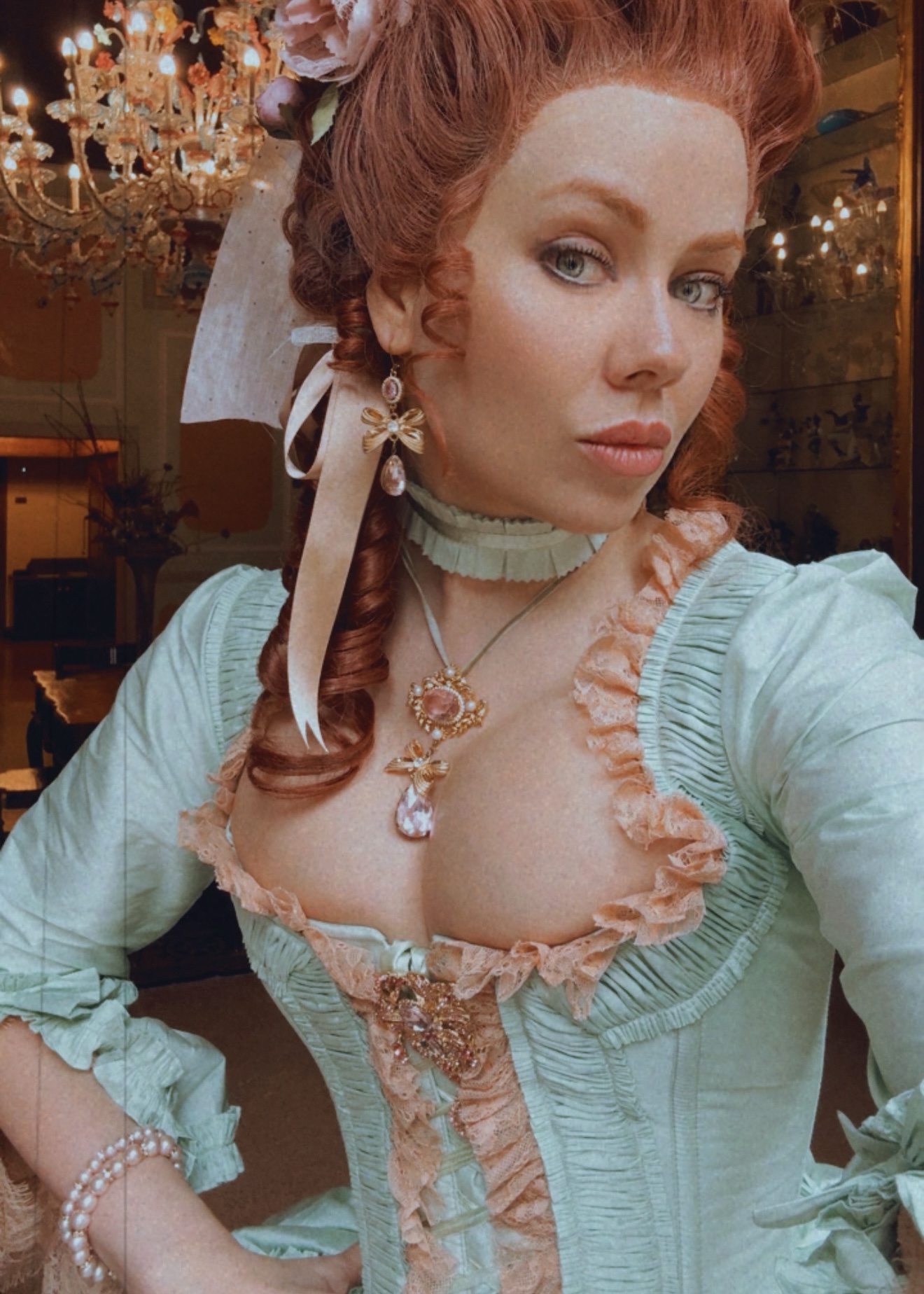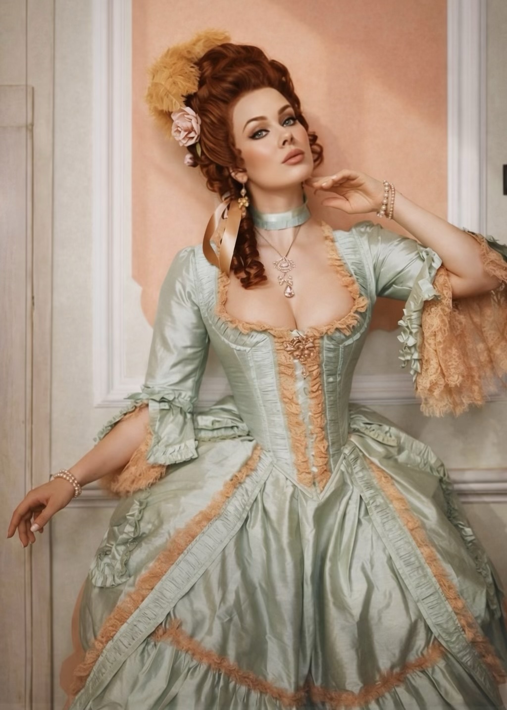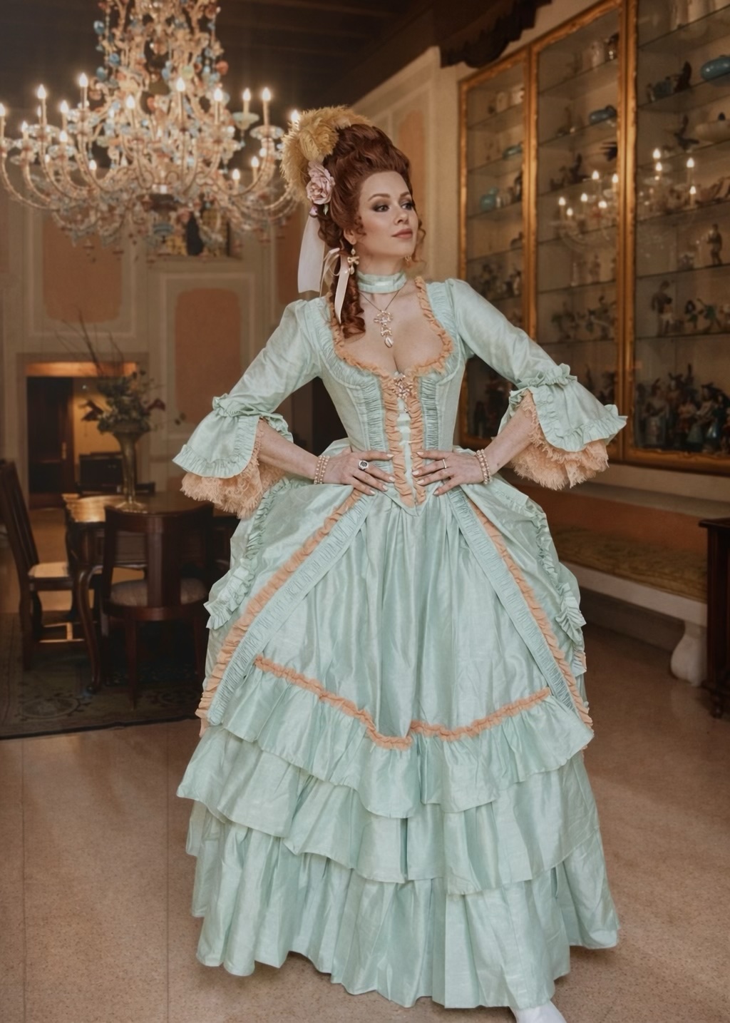 The Crème de Menthe Gown in delightful mint green taffeta with dusty rose lace features luxurious gathered ruffle trim. Designed to be worn with or without a corset under, but carefully created to give a structured look even without a corset due to perfectly placed, minimal boning (high quality, strong acrylic bones) in the front and sides. For comfort, it can be worn without a corset under, and still laced tight to reduce the waist! (Model wears without corset under. Size up if you want to wear a corset under.)