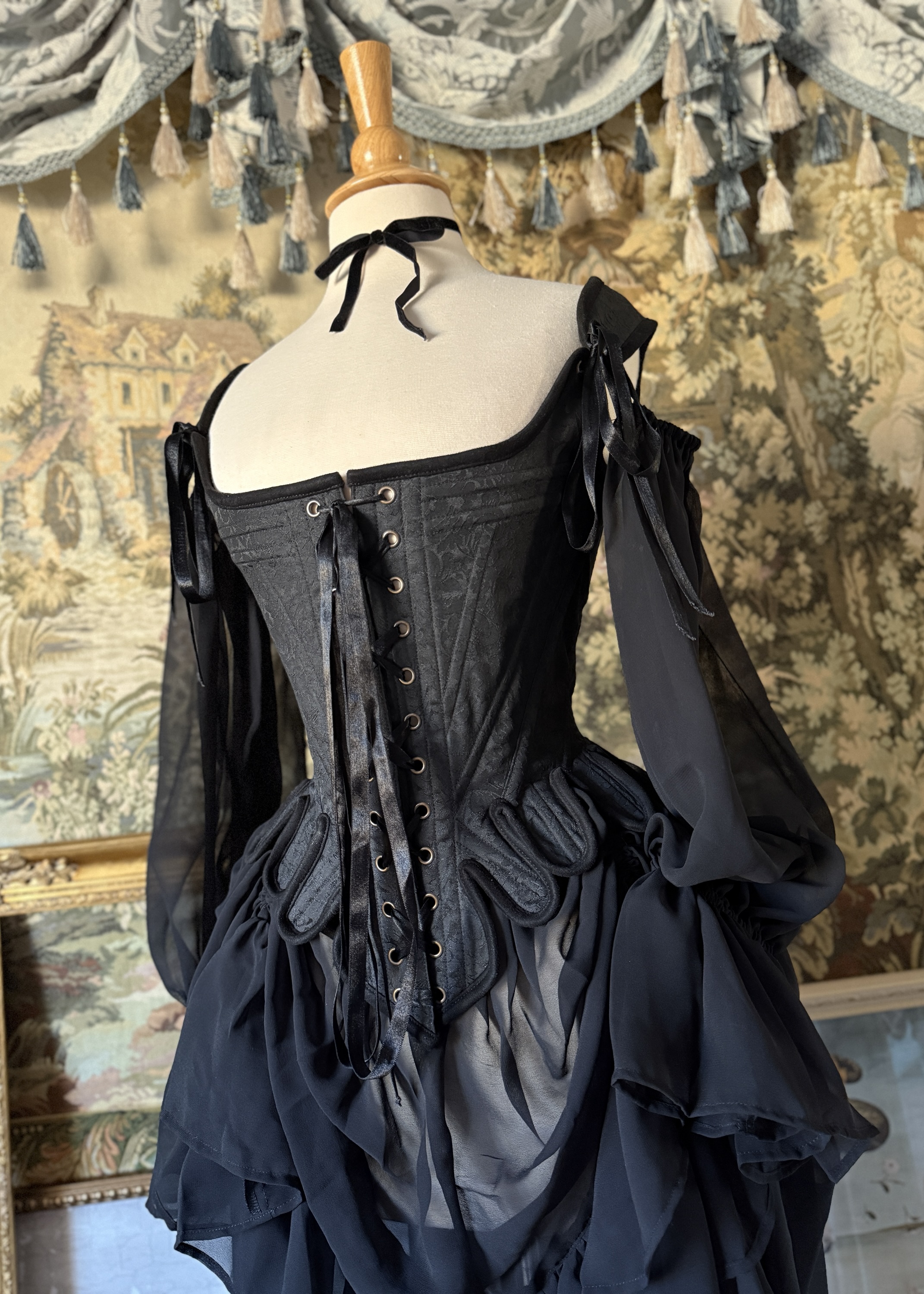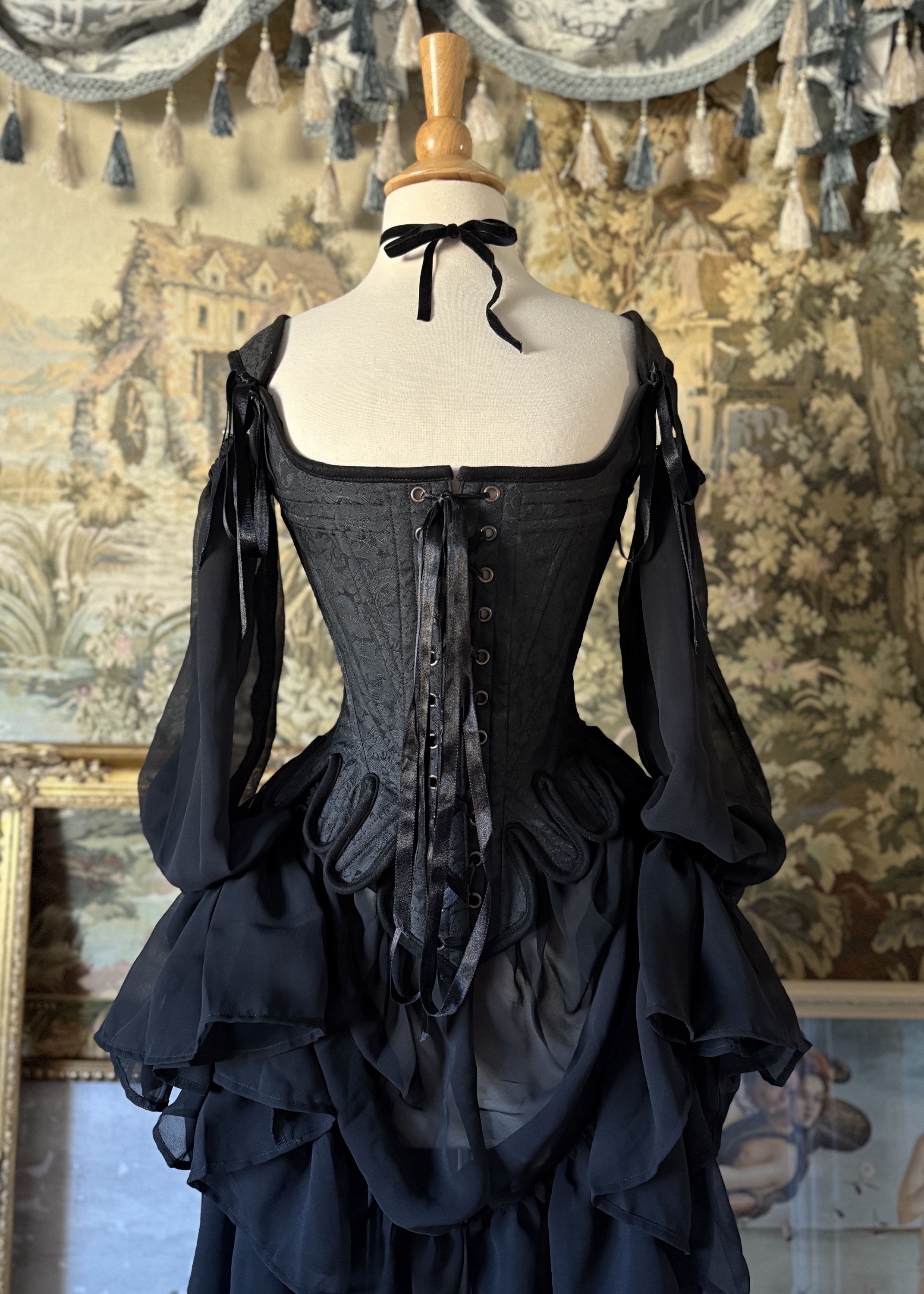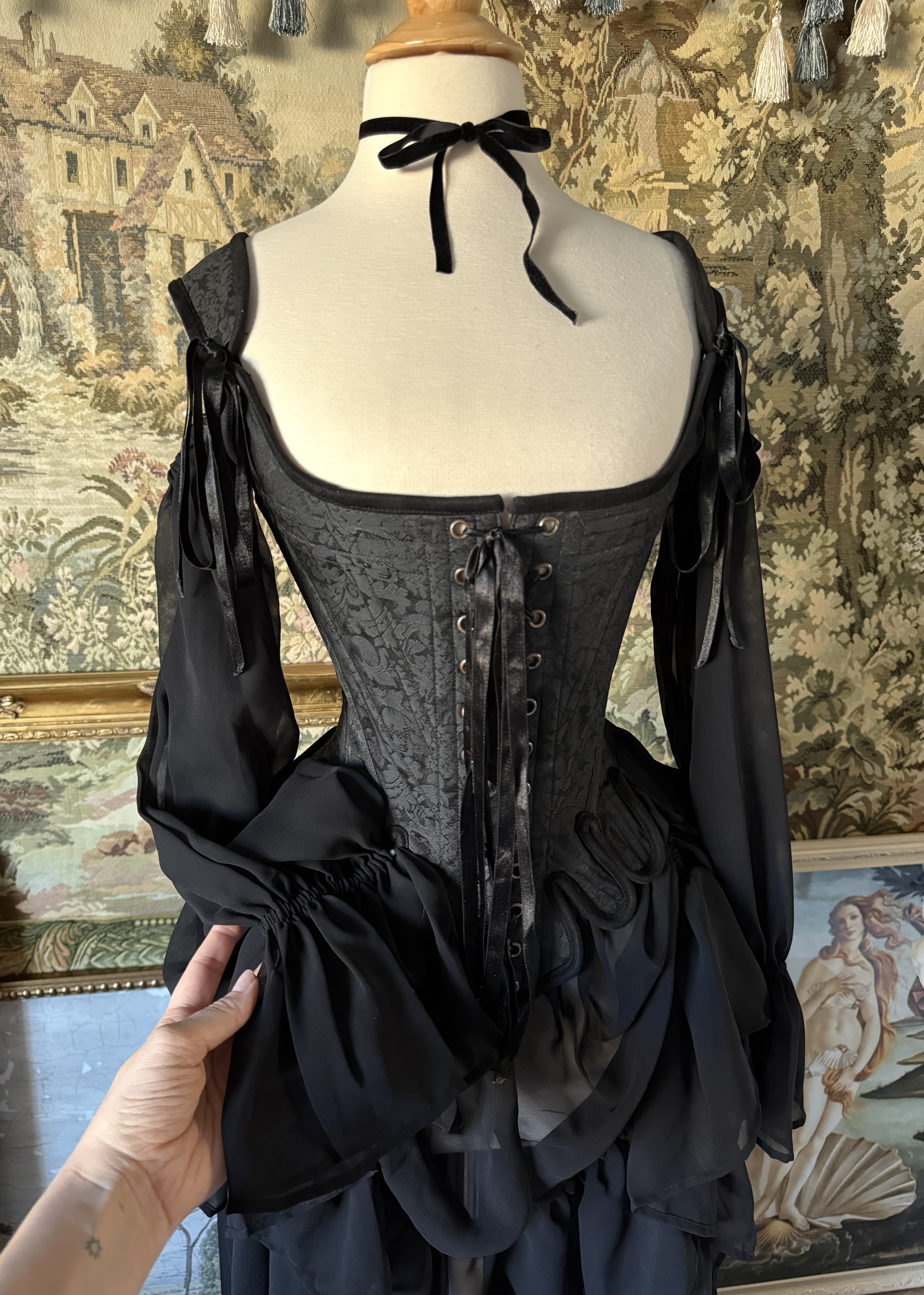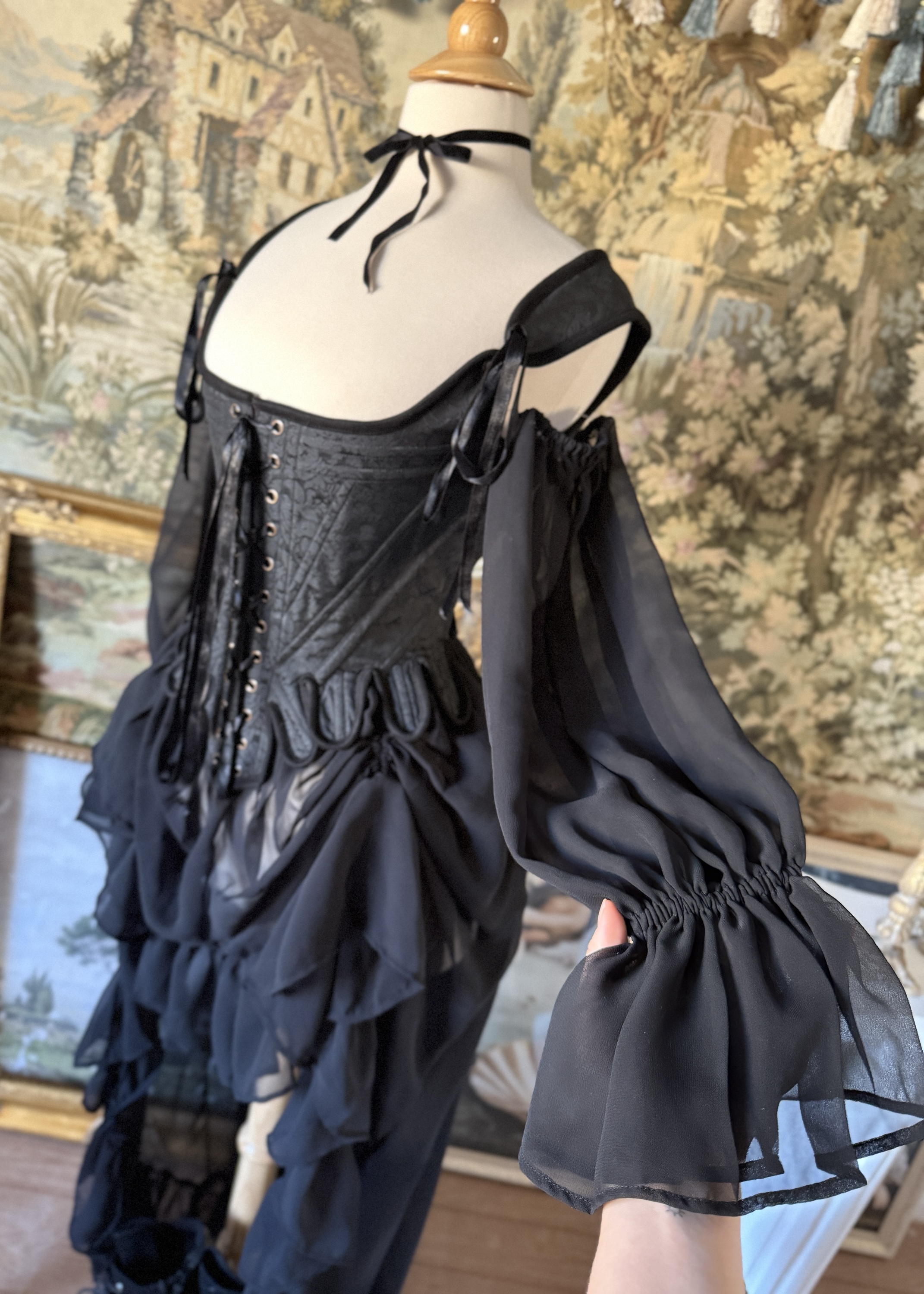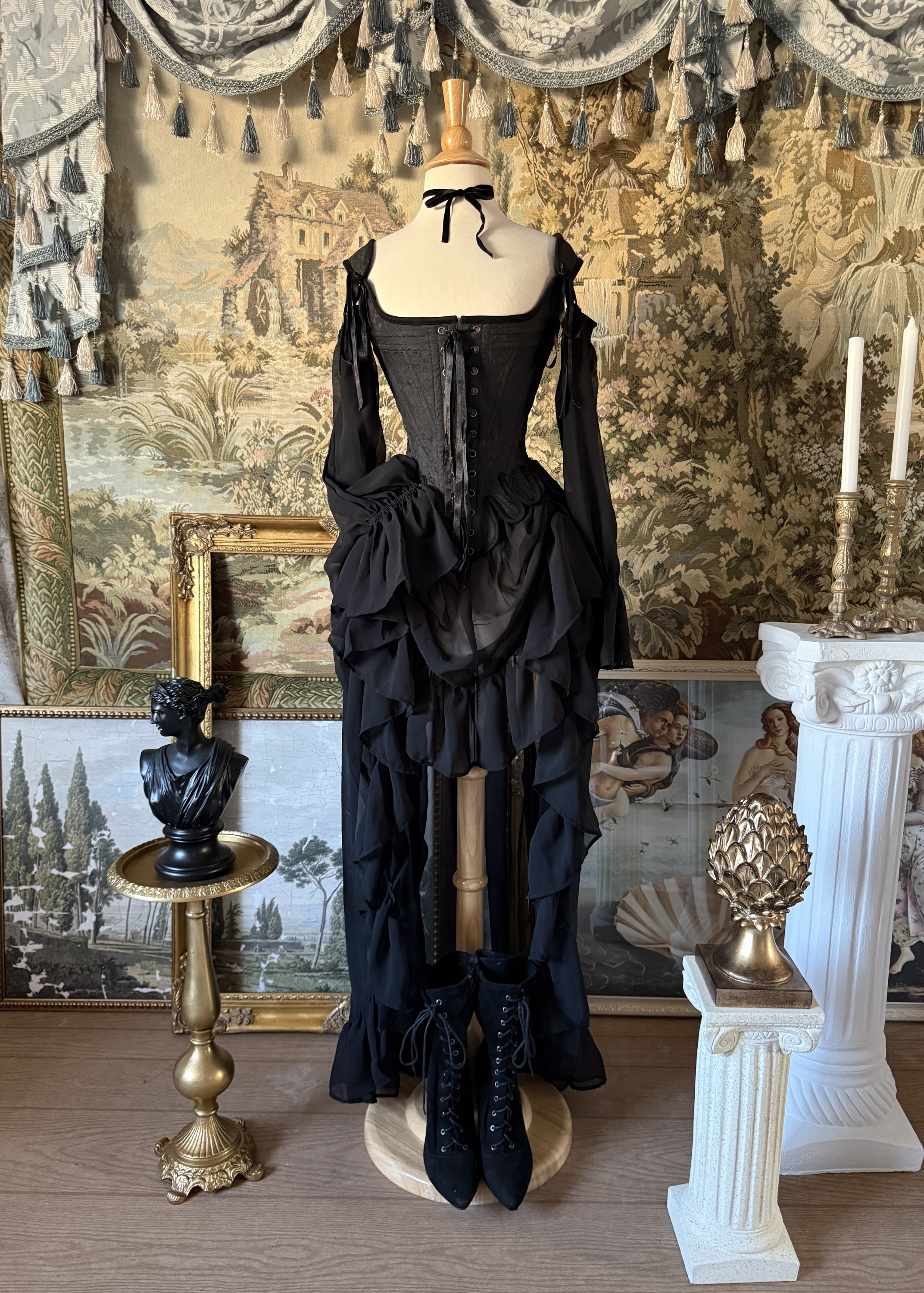 The Detached Sleeves in Black Georgette fabric are an all new outfit staple! Designed to be styled with the matching Night Court Skirt (seen styled here with the Sonia Stays) or can mix and match with almost anything! Make outfit styling all the more easy when wearing a corset and add that extra touch to elevate your look. Available in 2 sizes, custom sizes available via special order.