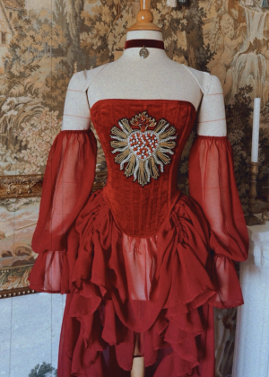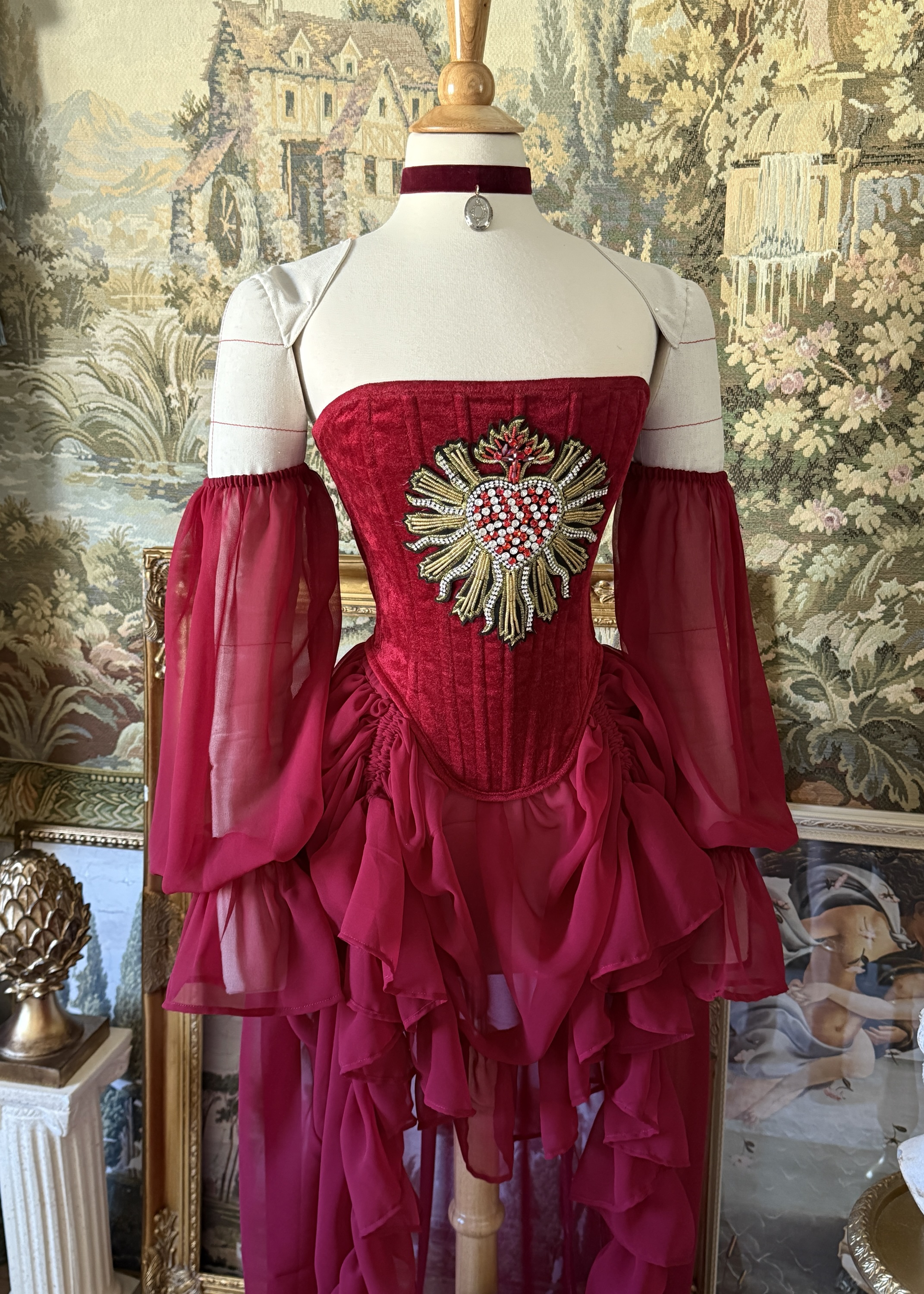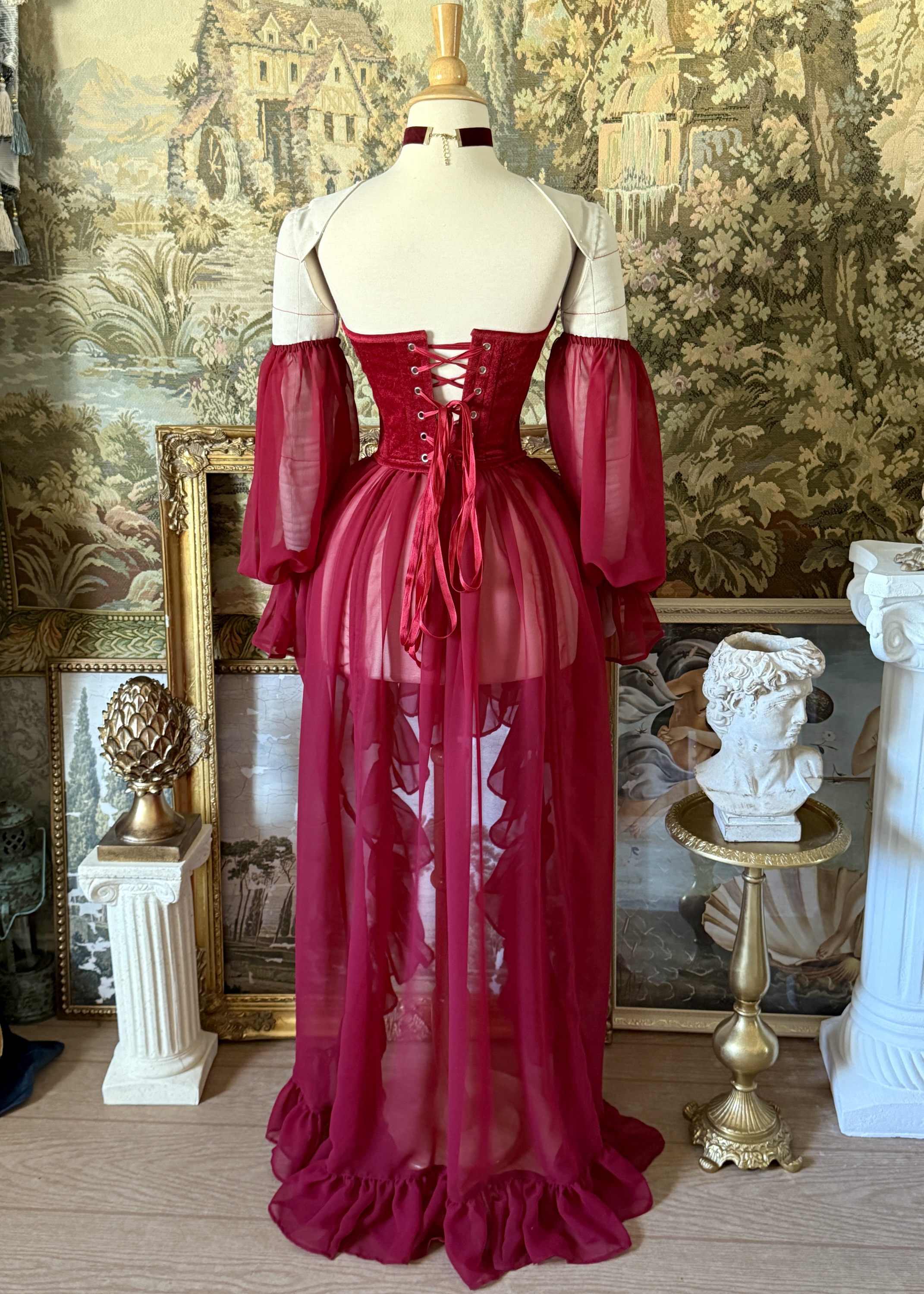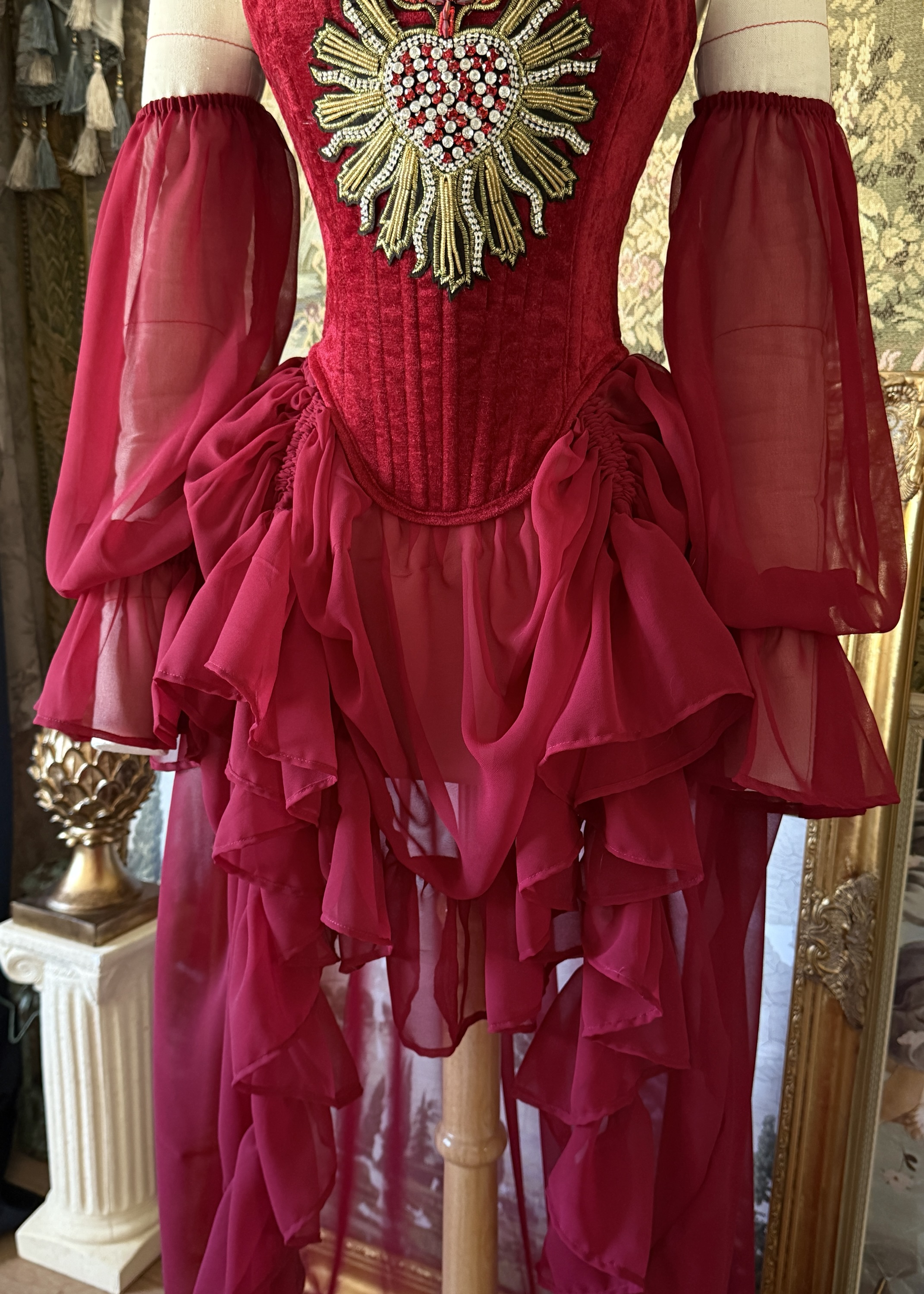 The Detached Sleeves in Rouge Georgette fabric are an all new outfit staple! Designed to be styled with the matching Amour Skirt (seen styled here with the Sonia Stays) or can mix and match with almost anything! Make outfit styling all the more easy when wearing a corset and add that extra touch to elevate your look. Available in 2 sizes, custom sizes available via special order.