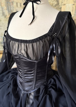 With romanticism on the mind, we knew our corsets needed to be layered with fluttering ruffles and floating sheer layers. Thus the addition of a perfectly feminine robe to the collection! With a sweet silhouette, ruffled hem and layered ruffle sleeves, and a waist tie at the front, the robe can be worn styled over top of your other garments or layered under your corset for an additional touch of romance.
