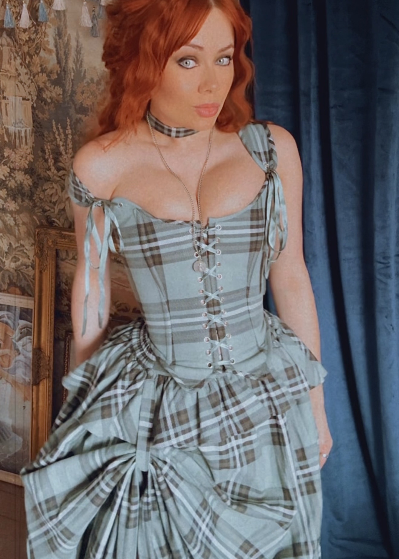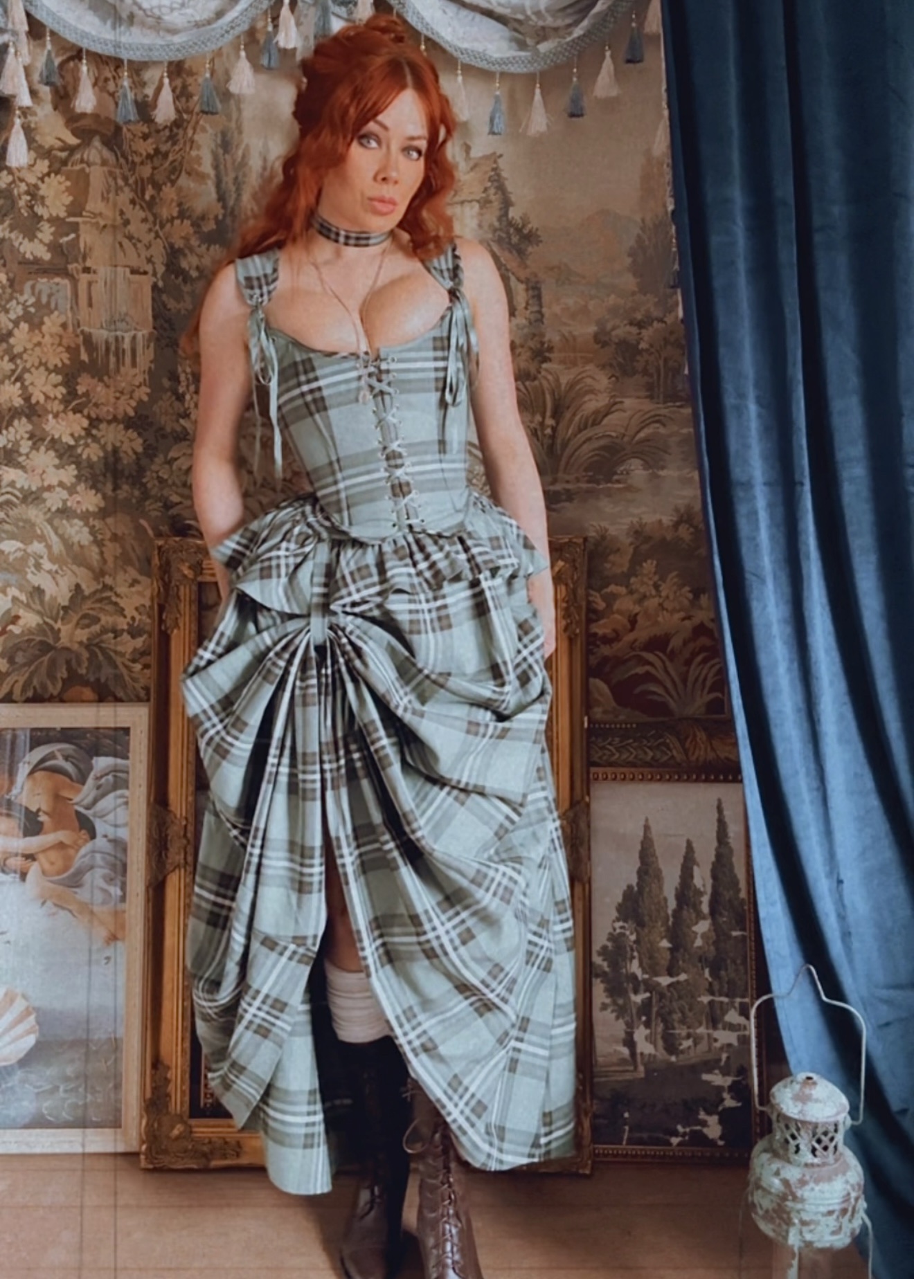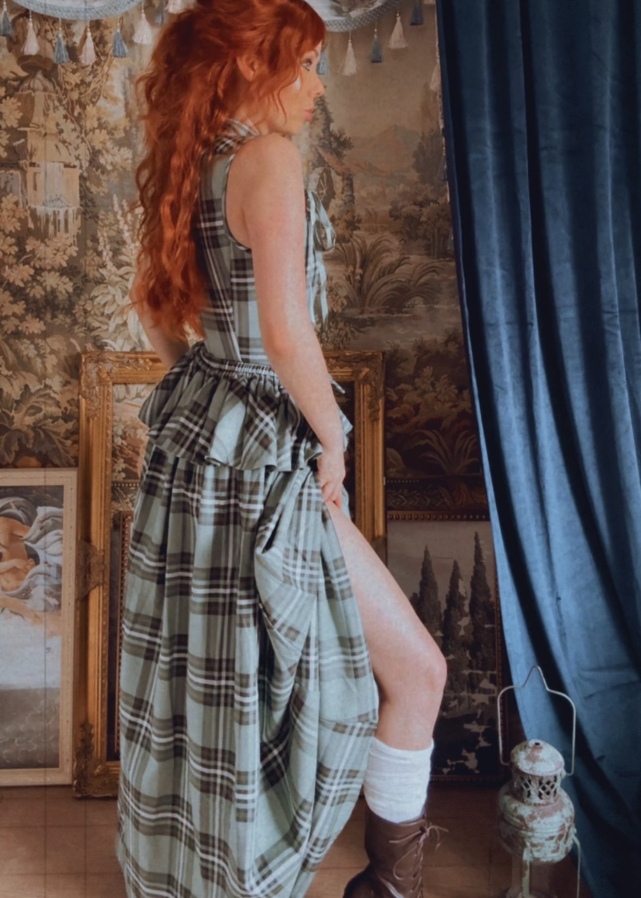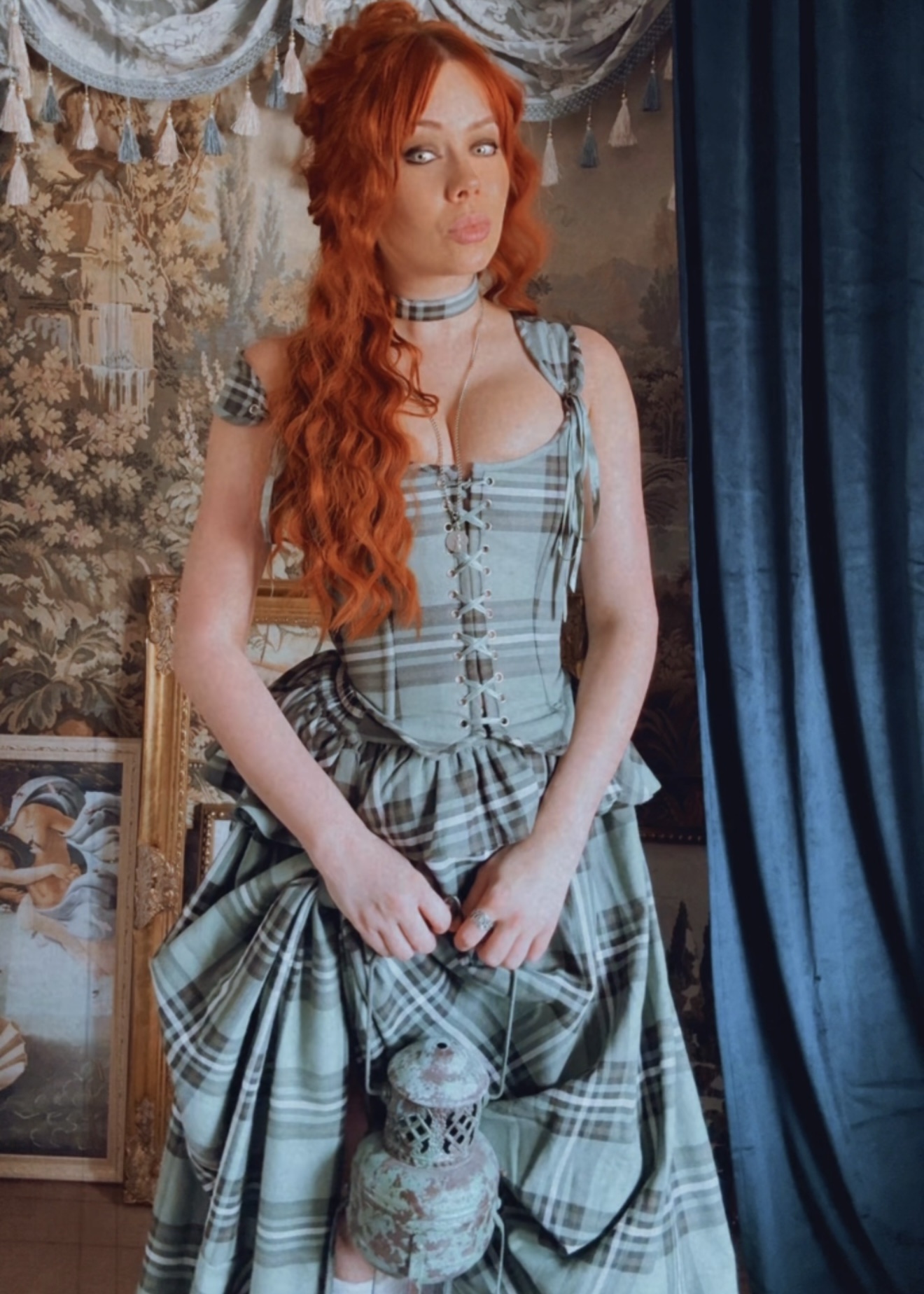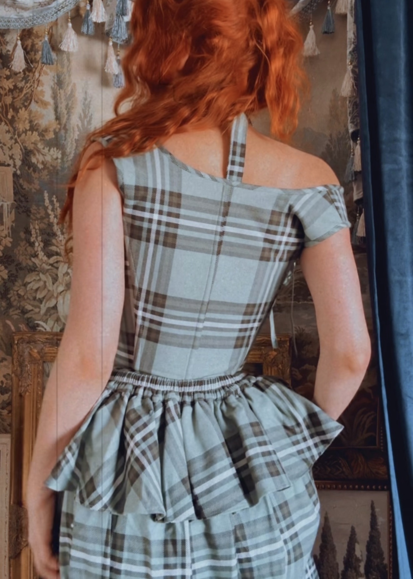 The skirt features a peplum frill around the waist, 2 sets of bustle straps in 2 different lengths for bustling the front and/or back to your preference, a flat front waist band and elasticated back, and pockets! The bustling is reminiscent of a tartan kilt or our take on a highlands lass, mixing elements of historical style with a feminine twist. (Featuring one of the bustle straps worn as a matching choker)