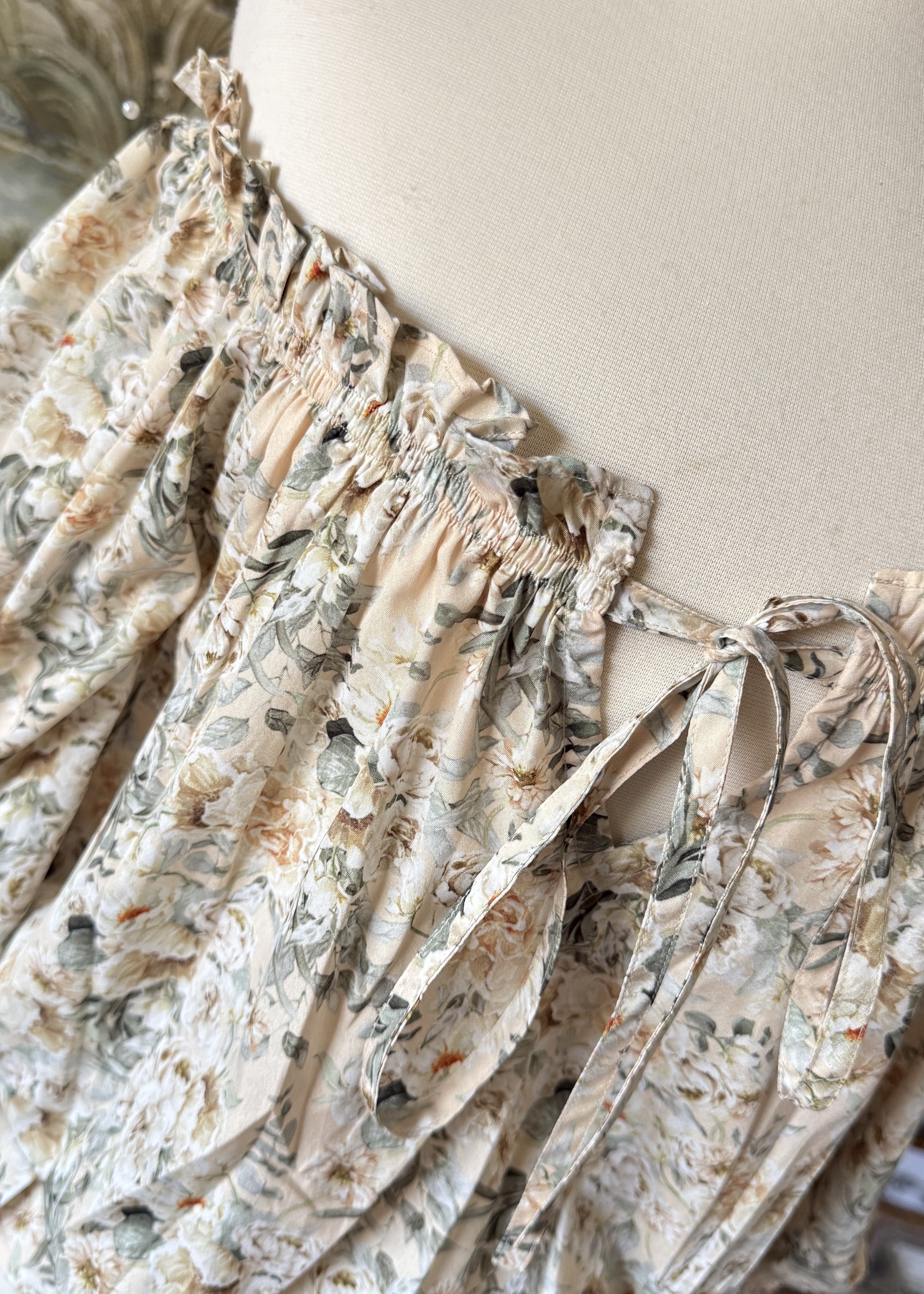 The Magnolia Blouse is part of a matching 3-piece ensemble with the Magnolia Skirt & Corset. This blouse features very soft crepe fabric printed in-house with our magnolia print design, a vintage inspired piece designed to style with many of our ensembles, whether layered or styled alone. The elasticated neckline, waist, and sleeves create a comfortable piece for dressing up or down, with so many layering options!