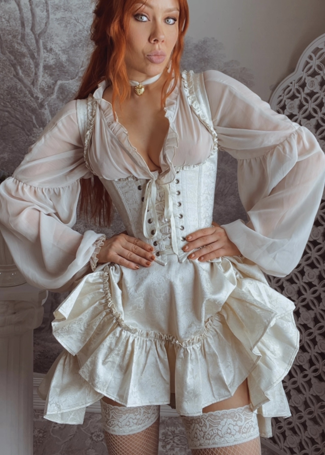 The Palais Underbust Corset is the perfect balance of elegance and sensuality with a Baroque-Rococo influence and modern twist. Featuring our own luxurious brocade in a creamy ivory shade, with a subtle texture and shine, and adorable ruffle detail. Reminiscent of palace curtains or wallpaper inspired by Palais Royale in Paris. Boned with high quality, strong acrylic for flexible comfort while maintaining highly structured support. Perfect for modern to historical, bridal to boudoir looks, and more!