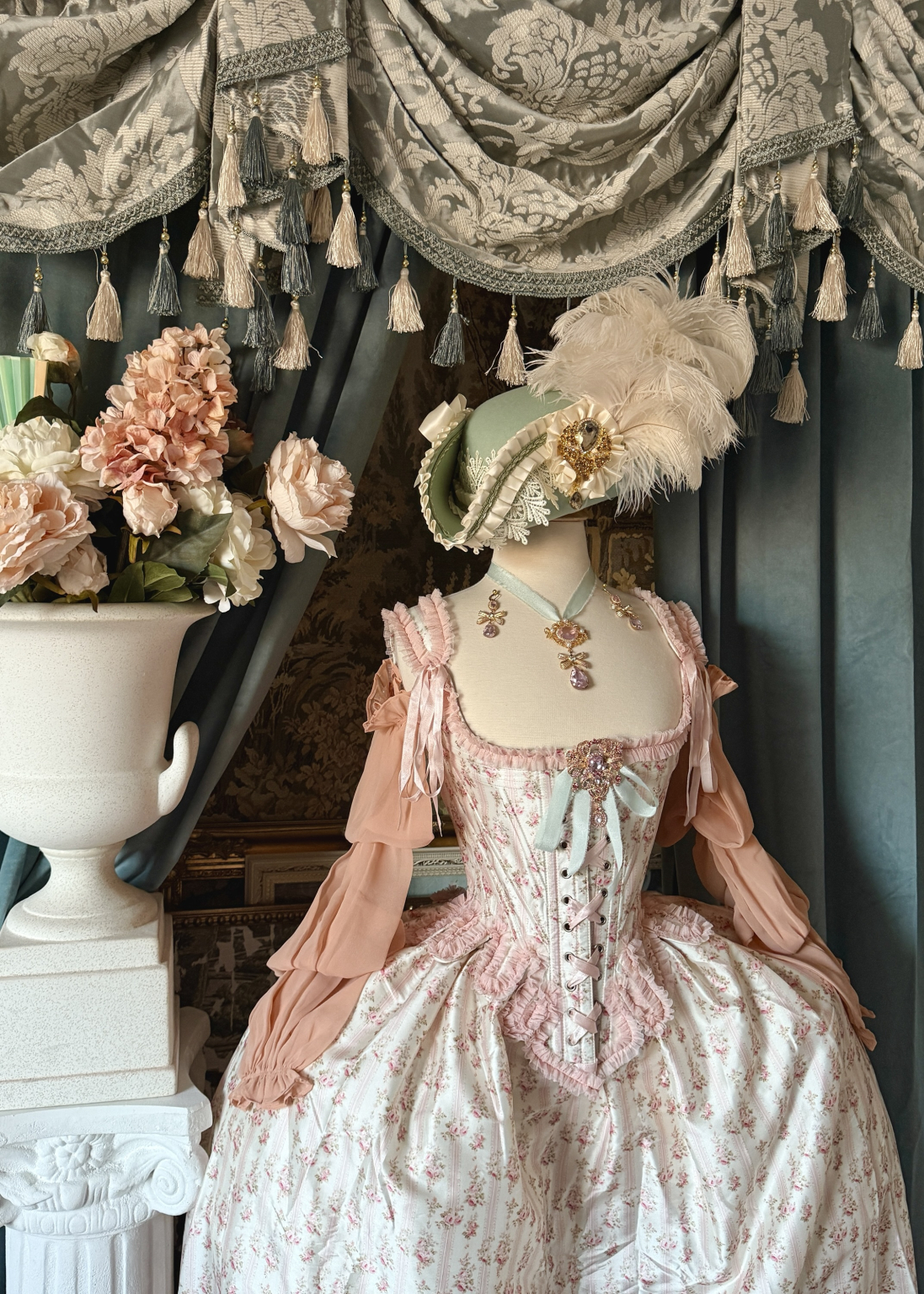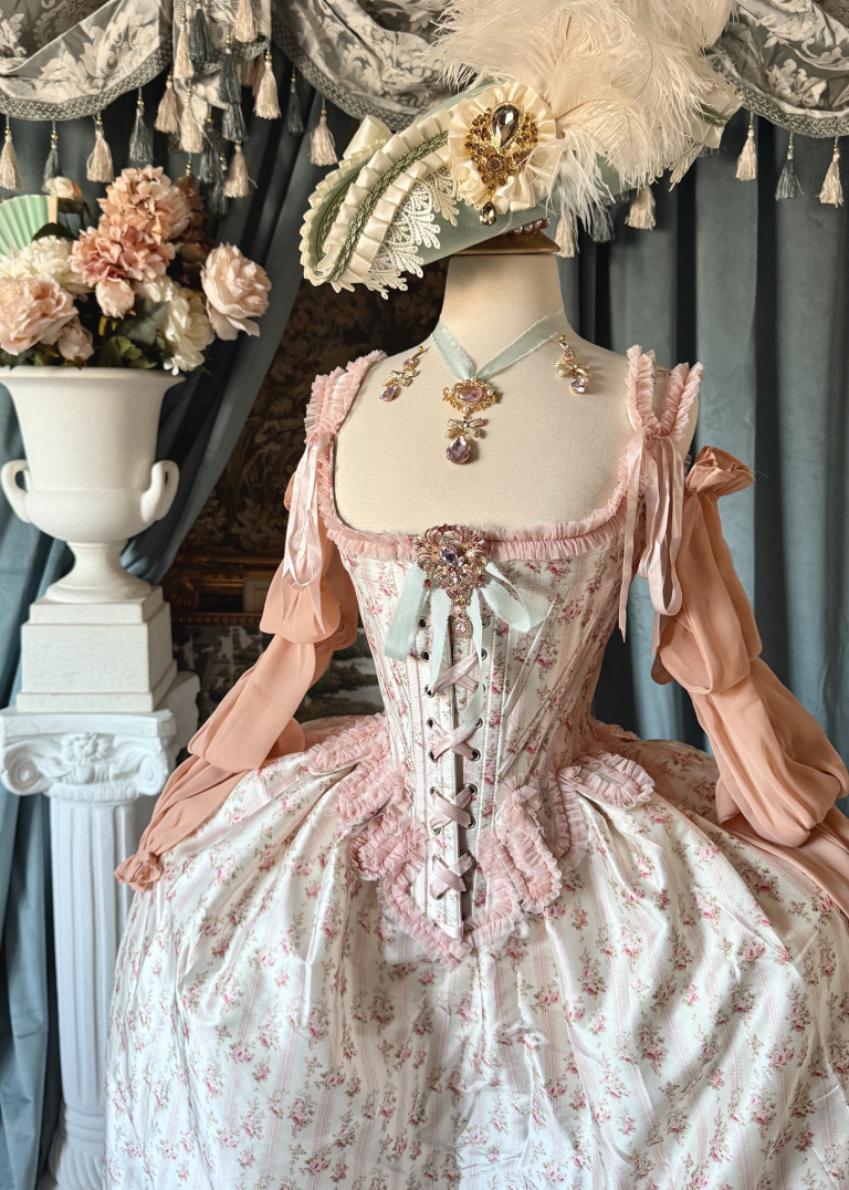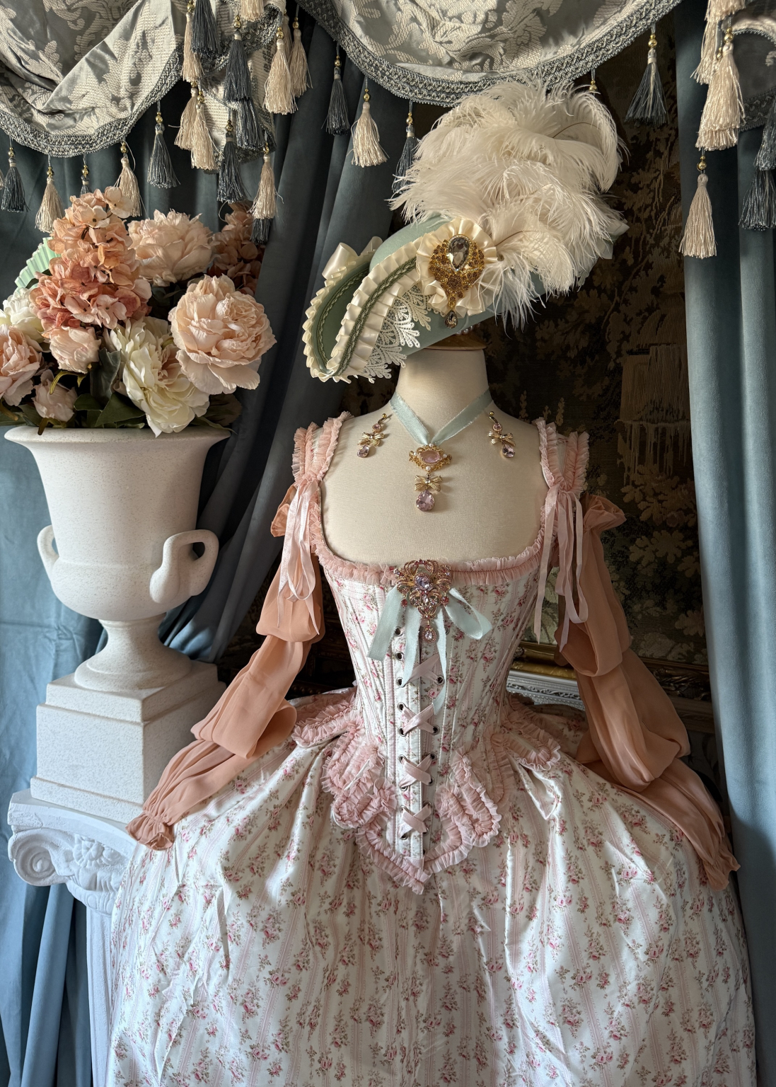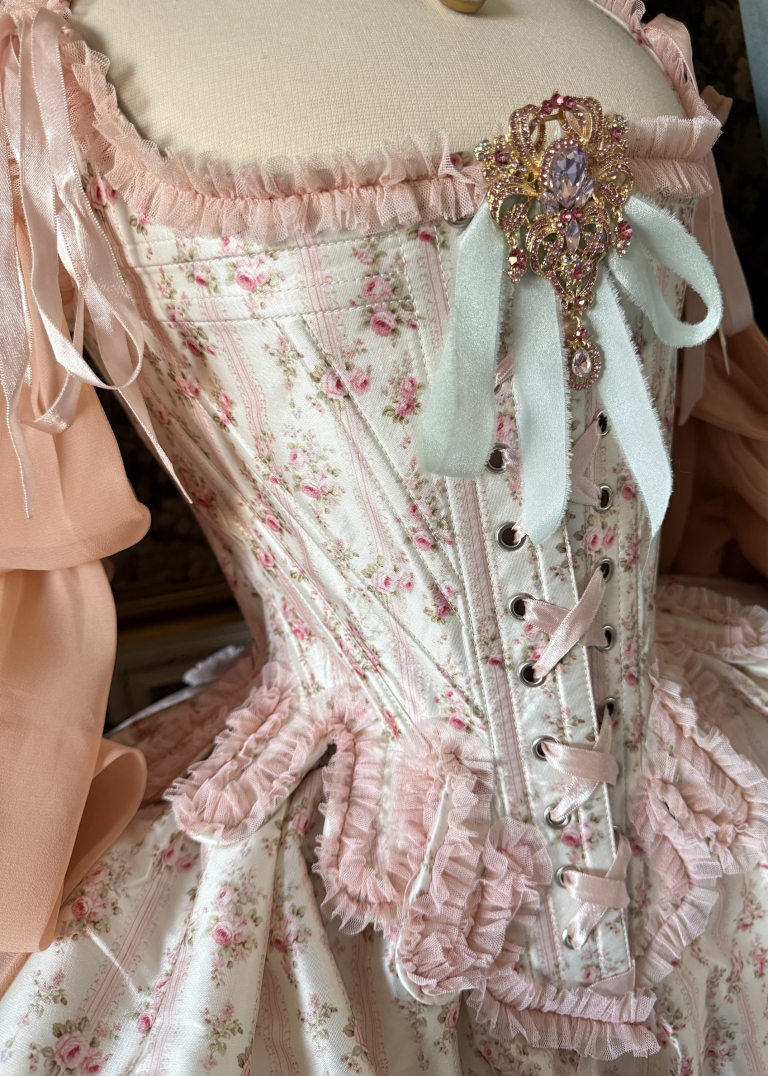 The Très Jolie Stays Corset is part of a set with the matching skirt. The custom print design featuring pink roses and pink stripes on an off-white background was made by Sarah and is printed on taffeta in-house. This historical stays design is authentic with waist tabs, in a luxurious silky taffeta, and trimmed with an adorable mesh ruffle for a regal Rococo look. Imagine yourself walking up and down the chateau halls in this beauty! You can wear this corset layered with a chemise for a historical look, or by itself for a bit more of a courtesan look.
