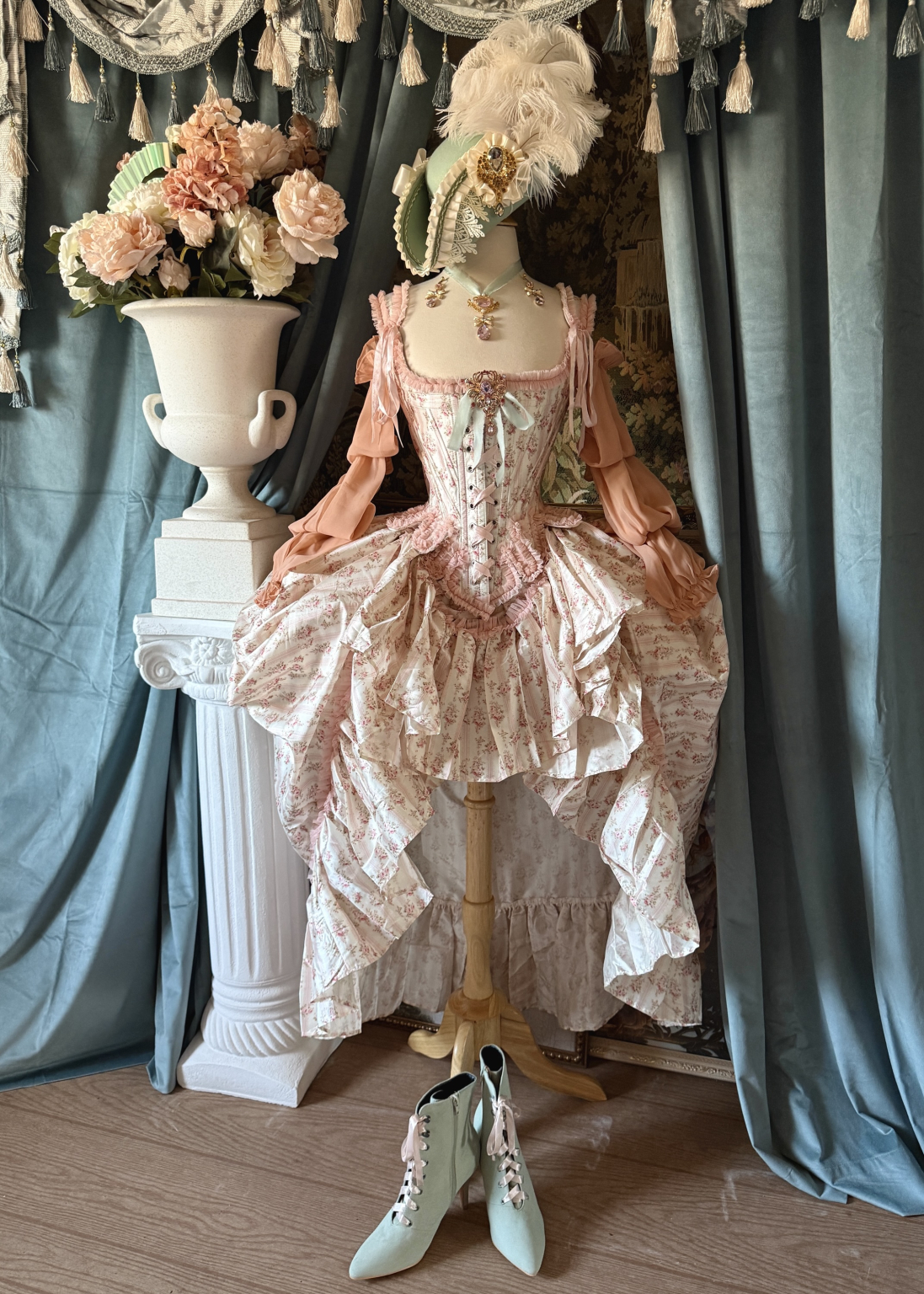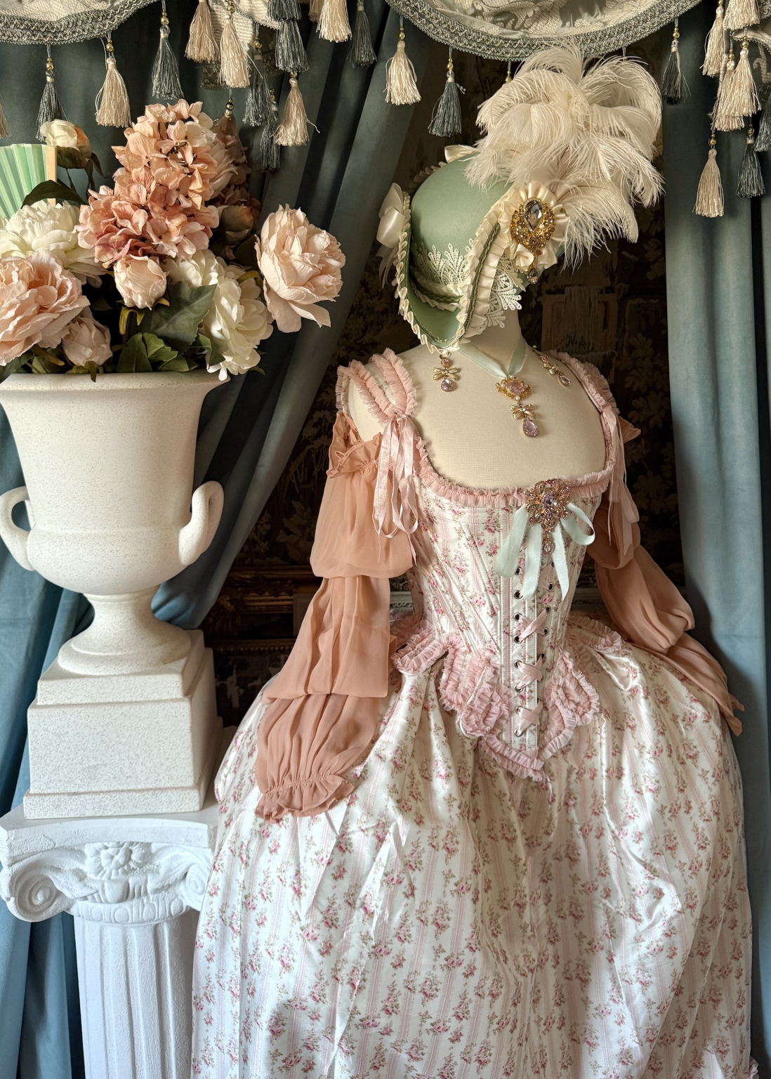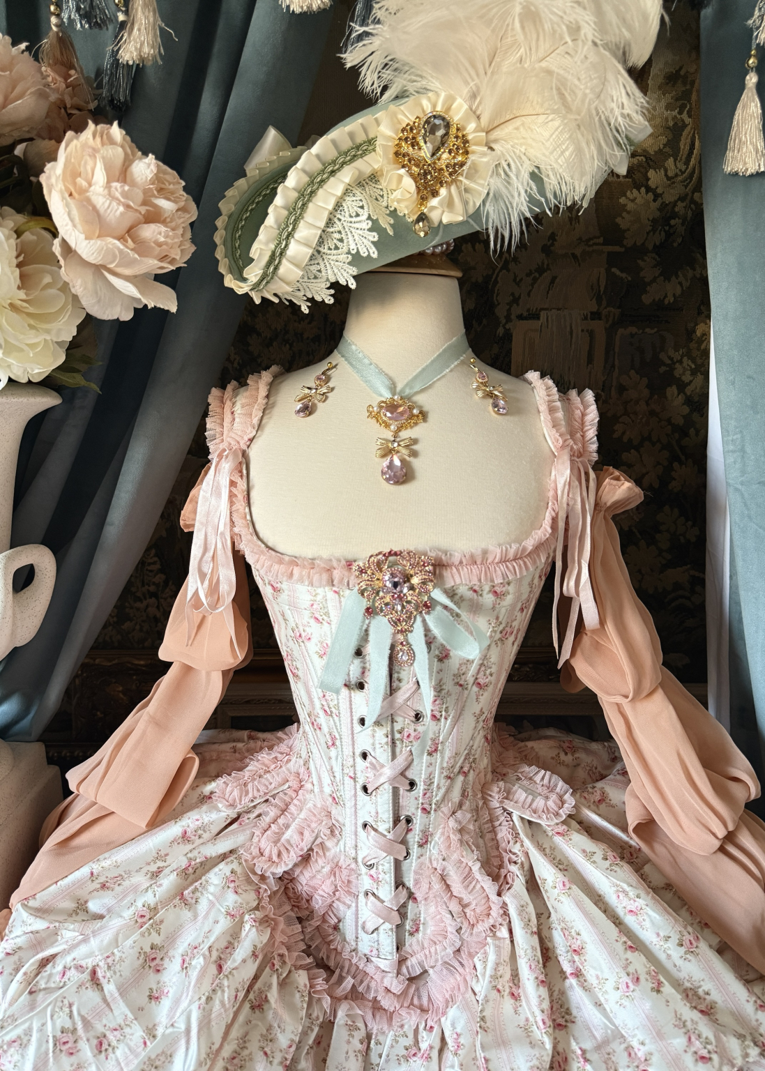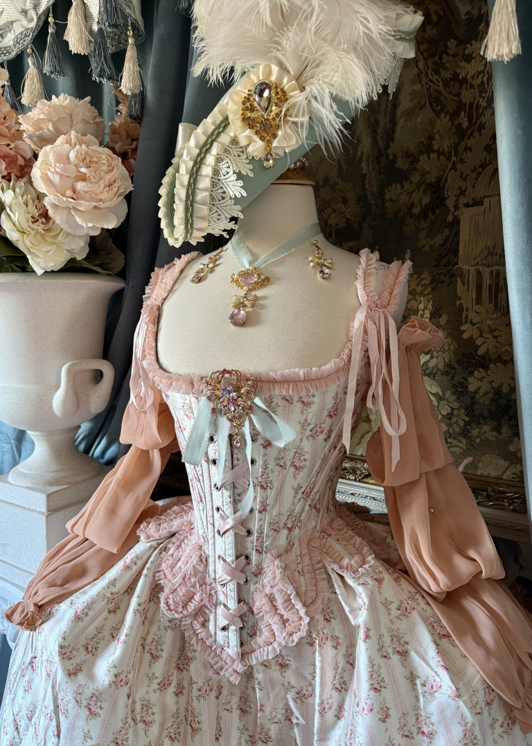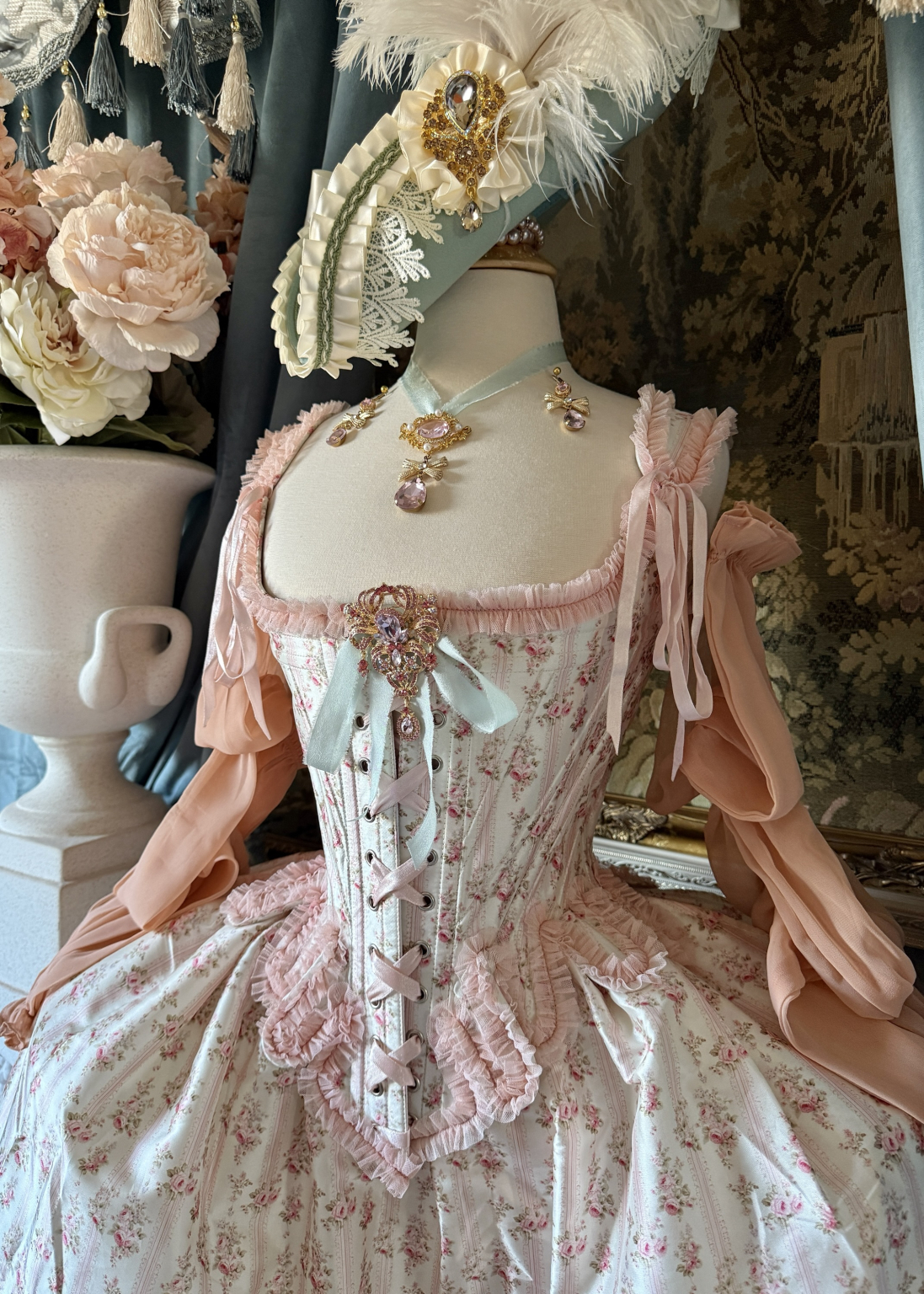 The Très Jolie Stays Corset is part of a set with the matching skirt. The custom print design featuring pink roses and pink stripes on an off-white background was made by Sarah and is printed on taffeta in-house. This historical stays design is authentic with waist tabs, in a luxurious silky taffeta, and trimmed with an adorable mesh ruffle for a regal Rococo look. Imagine yourself walking up and down the chateau halls in this beauty! You can wear this corset layered with a chemise for a historical look, or by itself for a bit more of a courtesan look.