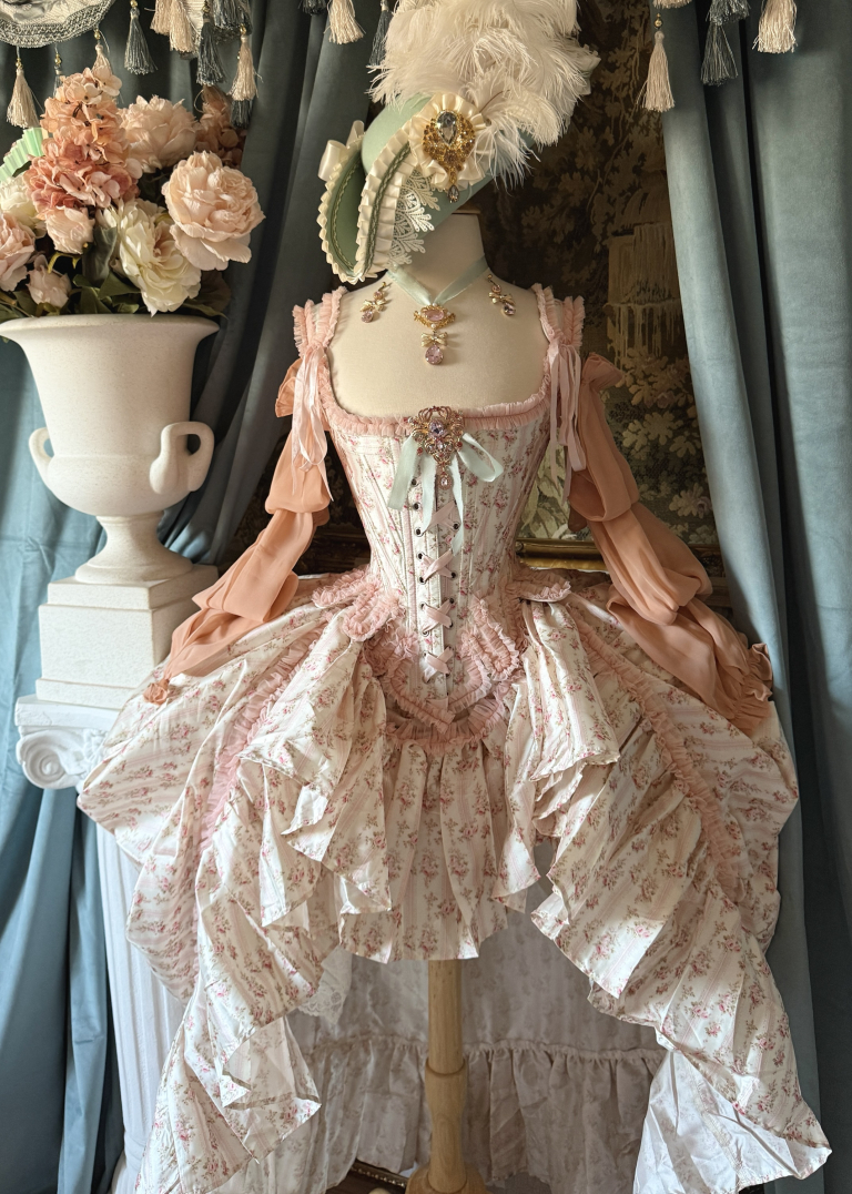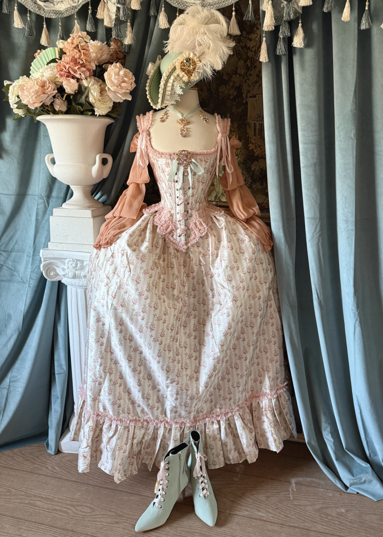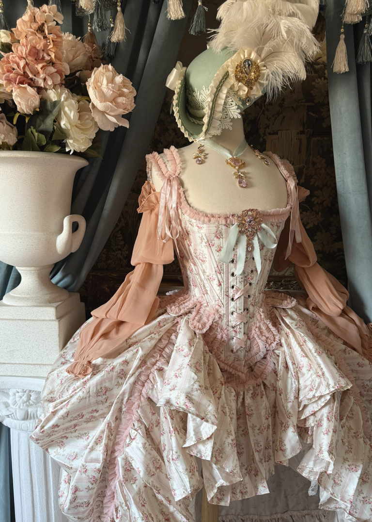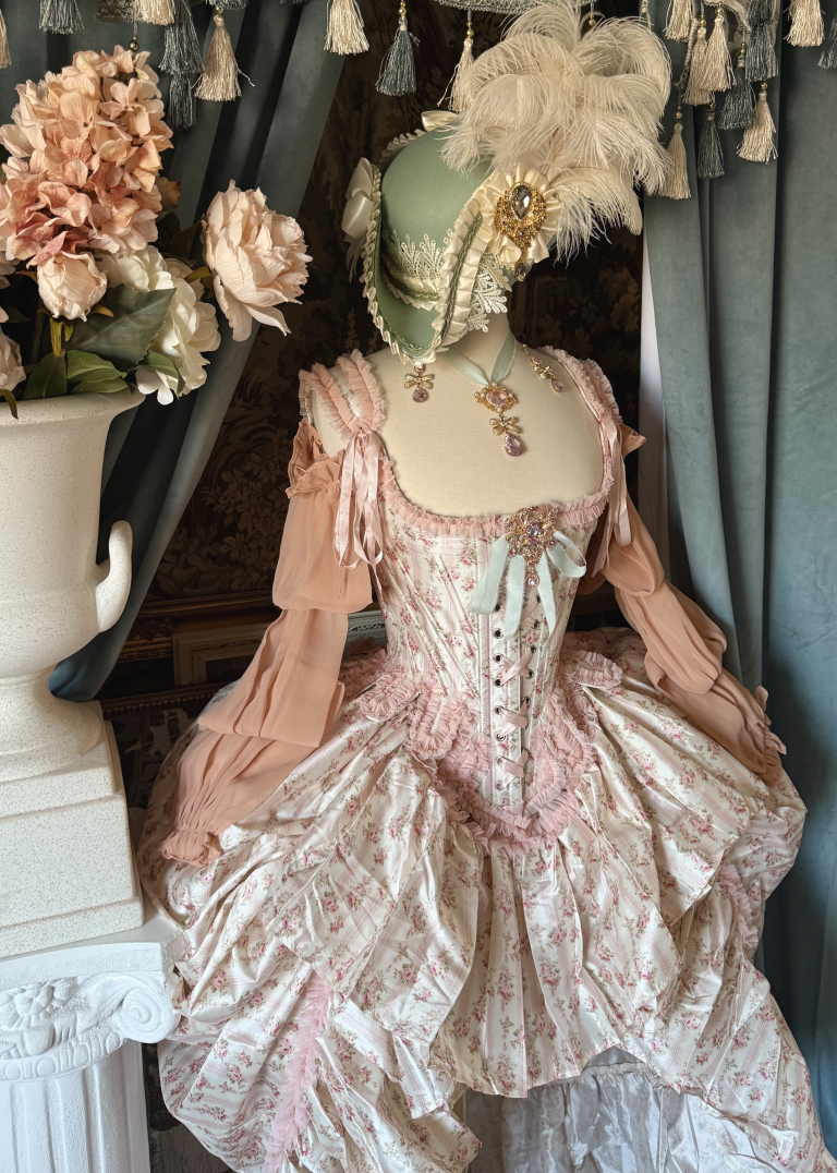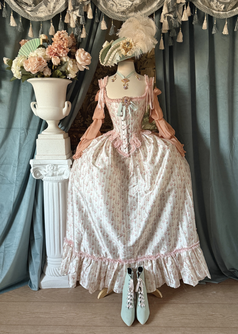 The Très Jolie Stays Corset is part of a set with the matching skirt. The custom print design featuring pink roses and pink stripes on an off-white background was made by Sarah and is printed on taffeta in-house. This historical stays design is authentic with waist tabs, in a luxurious silky taffeta, and trimmed with an adorable mesh ruffle for a regal Rococo look. Imagine yourself walking up and down the chateau halls in this beauty! You can wear this corset layered with a chemise for a historical look, or by itself for a bit more of a courtesan look.